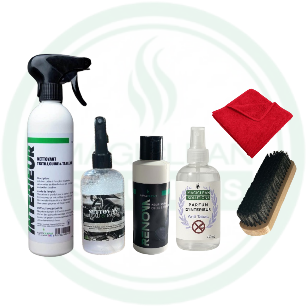 Pack de nettoyage intérieur pour voiture. Nettoie textiles, plastiques, cuir et tableau de bord, ravive les surfaces et protège l’habitacle. Inclut brosse et microfibre pour un résultat professionnel.