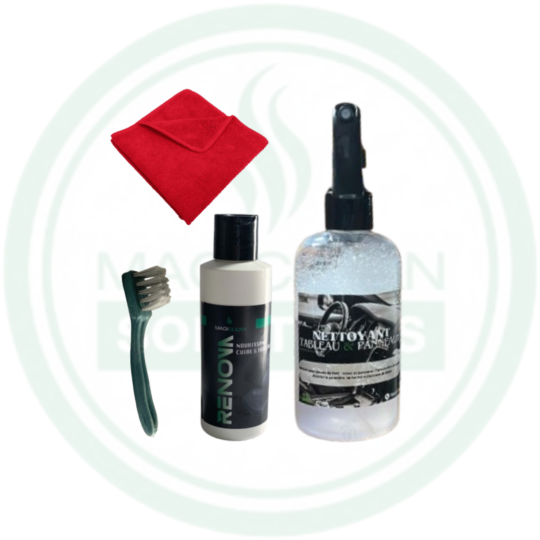 Il comprend un nettoyant textile & plastique 500 ml, parfait pour éliminer les taches, la poussière et les saletés incrustées sur les sièges en tissu, moquettes, tapis et plastiques intérieurs. Le nettoyant cuir & tableau de bord 500 ml nettoie en douceur, nourrit le cuir et redonne un aspect naturel aux tableaux de bord et surfaces plastiques sans effet gras.